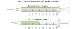 Remember: A vial of medication with a higher concentration means more of the drug in each milliliter of liquid and a vial of medication with a lower concentration means less of the drug in each milliliter of fluid